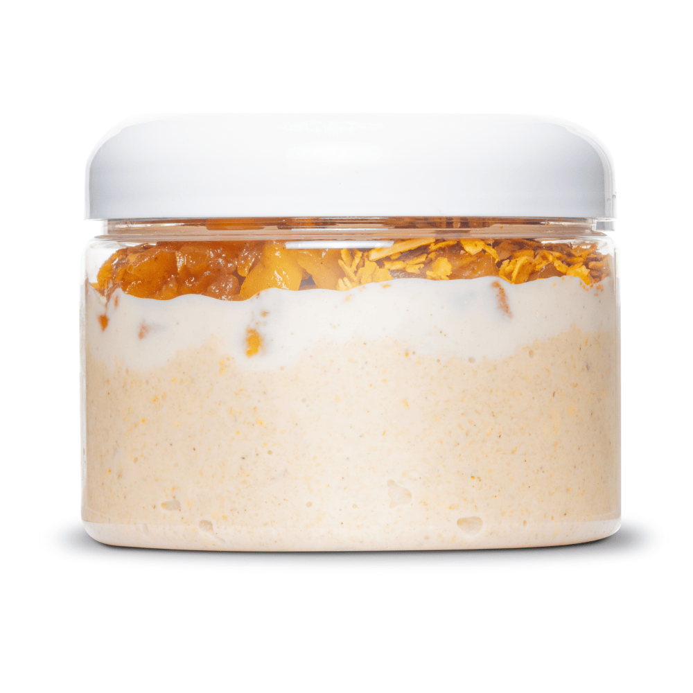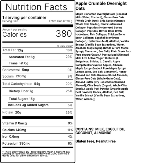 Cozy mornings, meet your new favorite cup! Our Apple Crumble Overnight Oats bring together the nostalgic flavors of apple pie with the wholesome fuel your body craves. Creamy overnight oats made with coconut milk, chia seeds, and collagen create a nourishing base, layered with tangy Greek yogurt for balance. Sweet honeycrisp apple compote swirled with maple and cinnamon adds a naturally comforting touch, while crunchy honey almond granola finishes it off with the perfect bite of texture.
