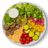 This is your favorite cheat meal — reimagined by a nutritionist and dressed up for your goals. Juicy Angus grass-fed ground beef from 44 Farms seared in avocado ghee meets a cool, crisp wedge salad base piled high with sharp cheddar, pickled onions, grape tomatoes, and a drizzle of creamy Greek yogurt ranch. Every bite balances smoky, spicy, and tangy — like your dream burger went to the spa.