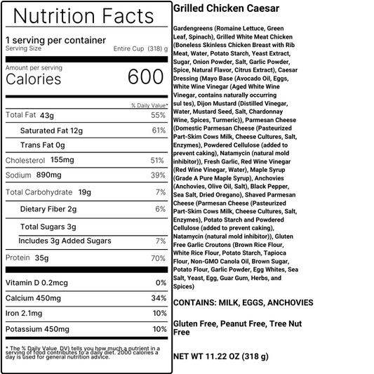 Macros displayed reflect protein option; see nutrition panels below for complete ingredient and nutrient info. Made in a kitchen that also handles most common allergens (eggs, fish, shellfish, peanuts, tree nuts, milk, soy, wheat). Those with severe food allergies are advised not to consume.