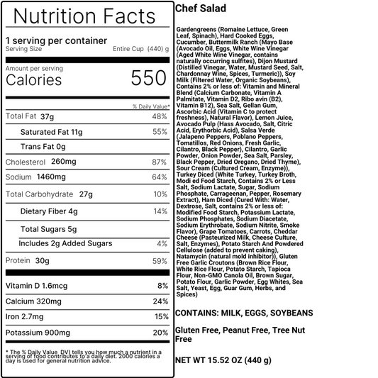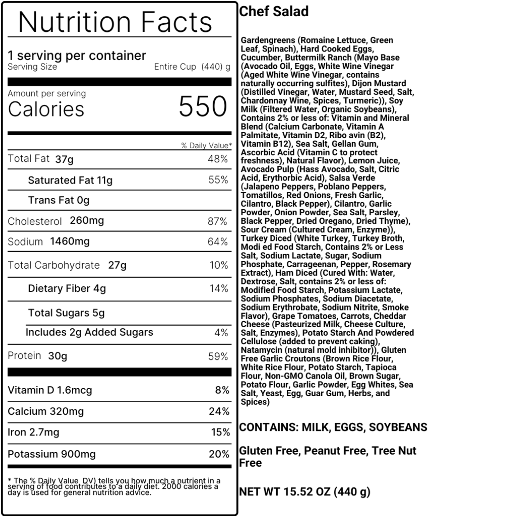 Macros displayed reflect protein option; see nutrition panels below for complete ingredient and nutrient info. Made in a kitchen that also handles most common allergens (eggs, fish, shellfish, peanuts, tree nuts, milk, soy, wheat). Those with severe food allergies are advised not to consume.