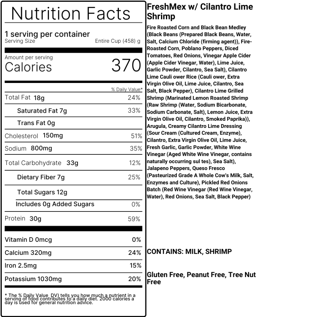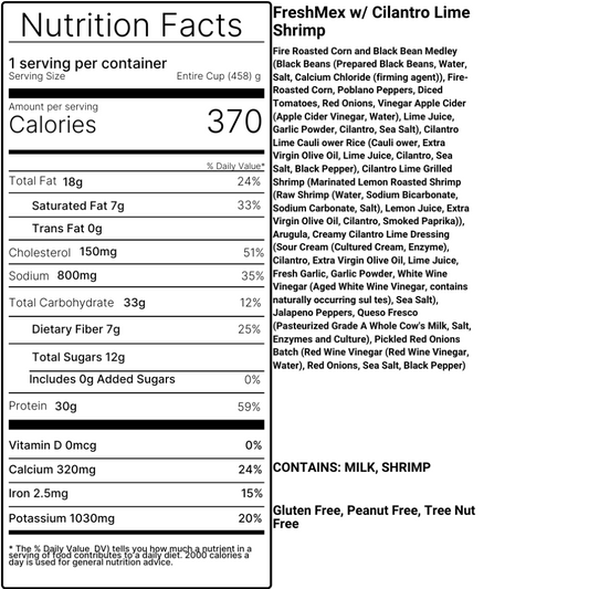Bold, zesty, and beach-body friendly. This protein-packed powerhouse serves fire-roasted corn, black beans, and juicy grilled shrimp over a bed of cauliflower rice and arugula—all tossed in a creamy cilantro lime dressing that dreams are made of. Finished with a pop of pickled red onions and crumbled cotija cheese for that extra ooh yes. Perfect for power lunches, post-work out fuel-ups, or that 3PM slump when you're thisssss close to ordering a burrito, but realize you have something way better waiting for you in the fridge.