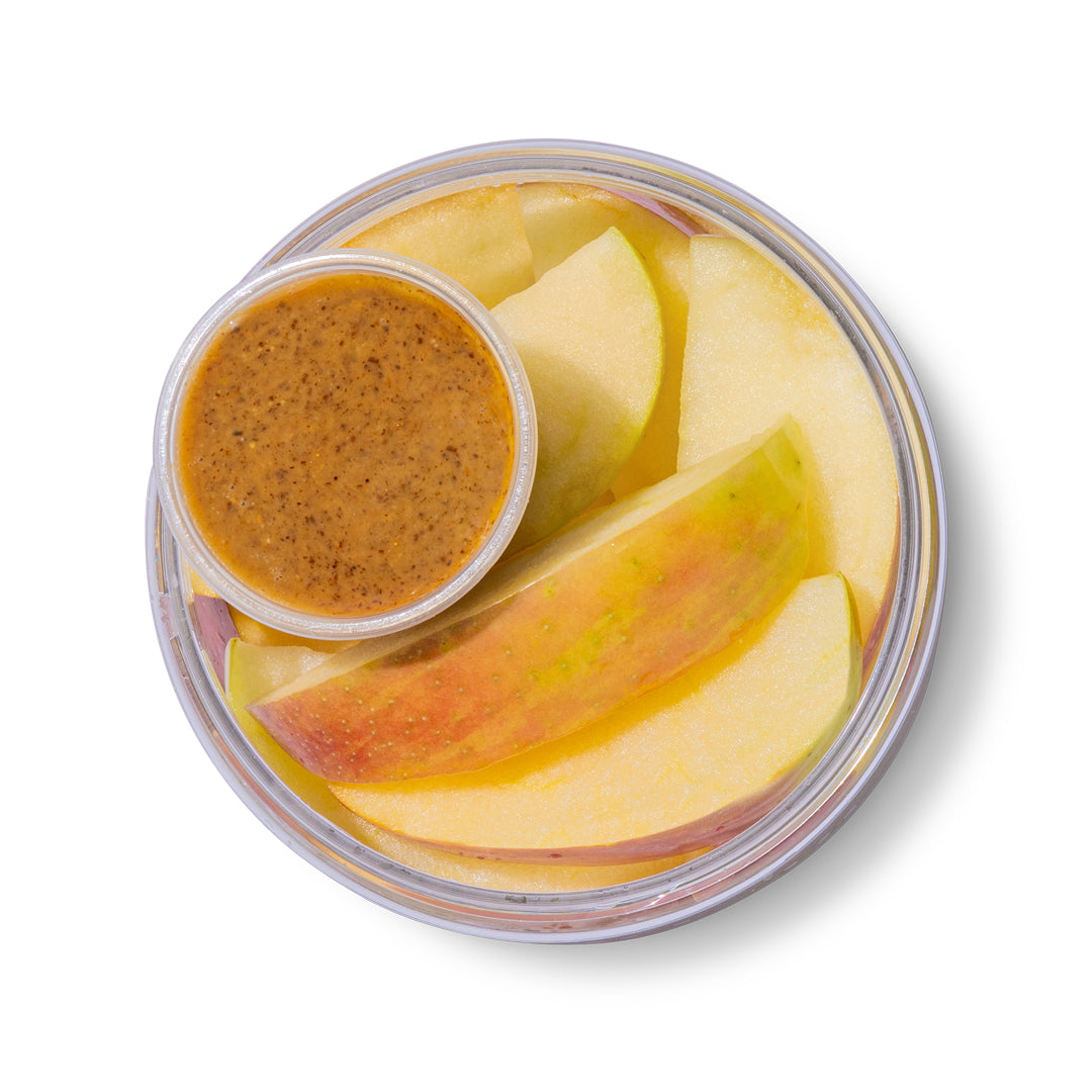 Fresh-sliced, washed, and ready-to-eat red Honeycrisp apples with an almond butter dip cup.